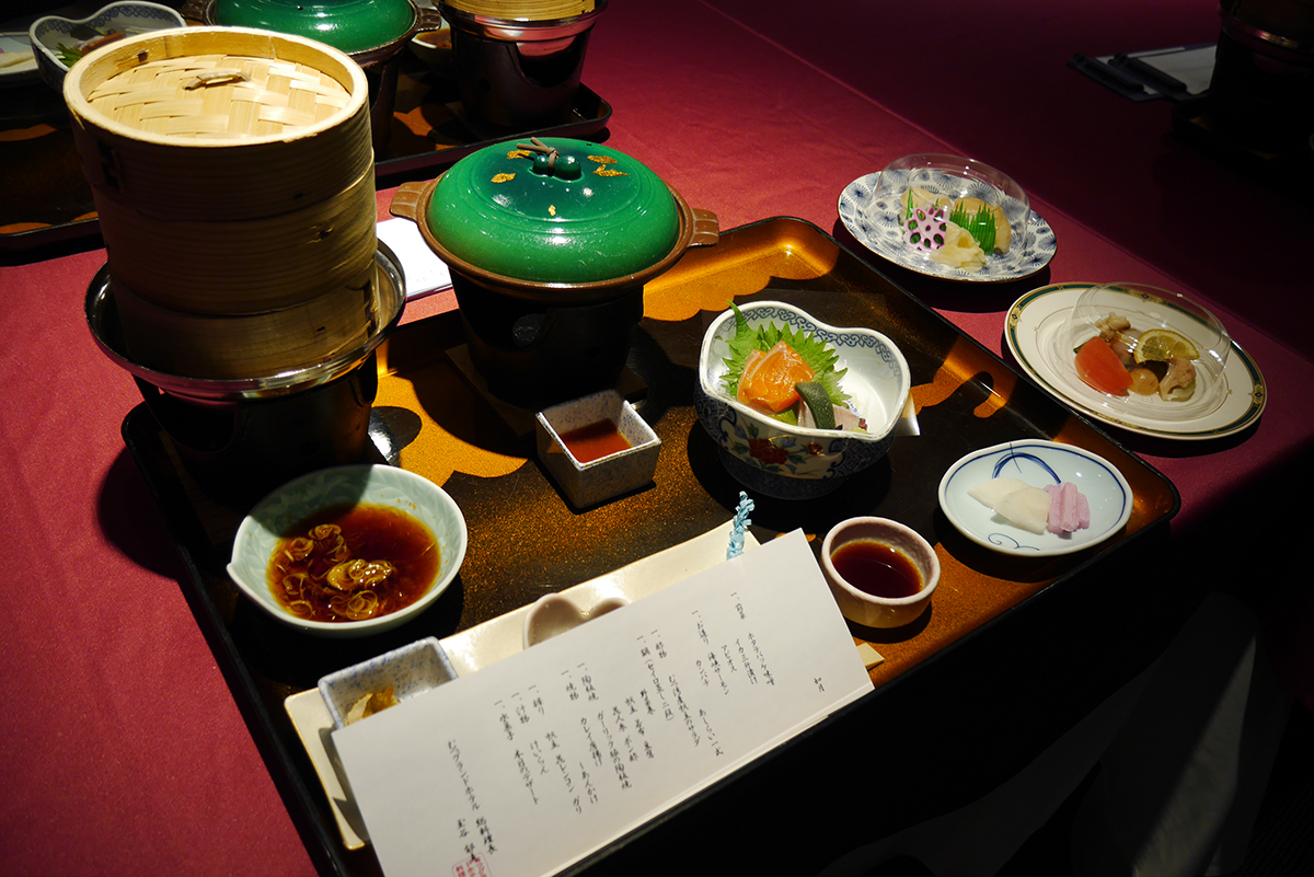 เผลอแป้บเดียวก็ได้เวลารับประทานอาหารเย็น เย็นนี้ได้รับเชิญจากเจ้าหน้าที่เมืองอาโอโมริ (Aomori) กินเลี้ยงร่วมกันที่ห้องอาหารของโรงแรม จัดมาเสิร์ฟแบบชุดใหญ่ มีทั้งหม้อต้มที่ปิดฝามาสนิท ทำให้ลุ้นว่าข้างในจะมีอะไรอยู่ มีทั้งตะกร้าสานนึ่งอะไรสักอย่างข้างใน ออเดิร์ฟจานเล็กๆ แต่น่ารักอีกหลายจาน ปลาดิบ หอยเชลล์ ซูชิ พอได้เวลาเริ่มกินก็จะมีพนักงานมาจุดไฟในเตาต่างๆ